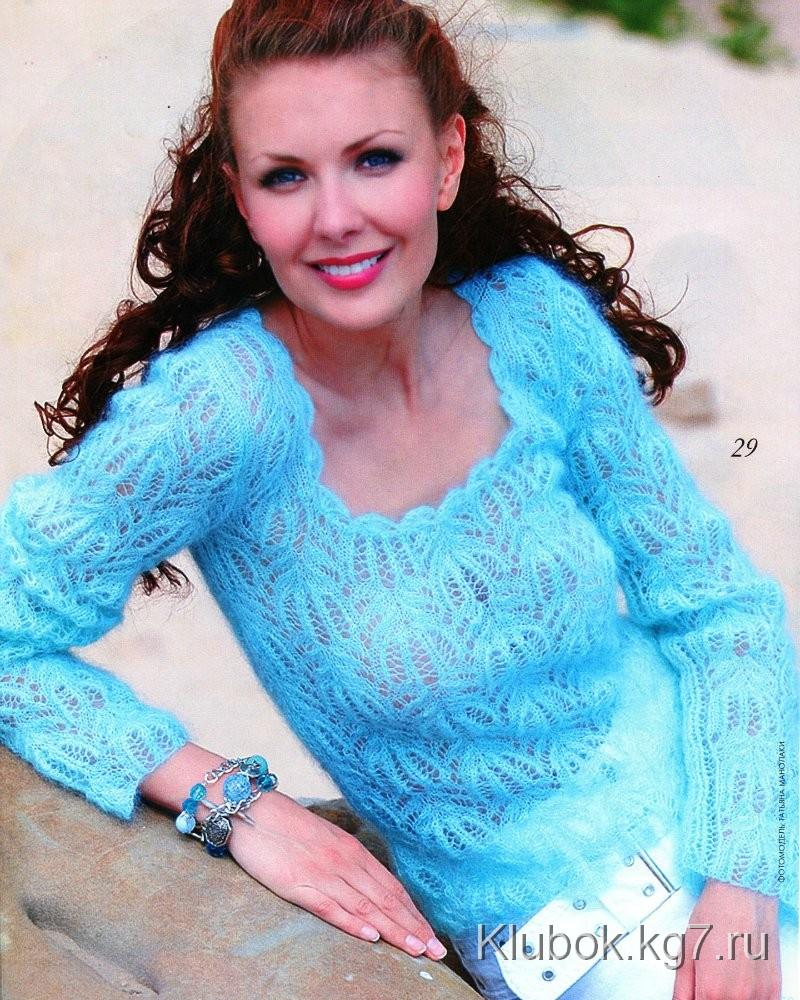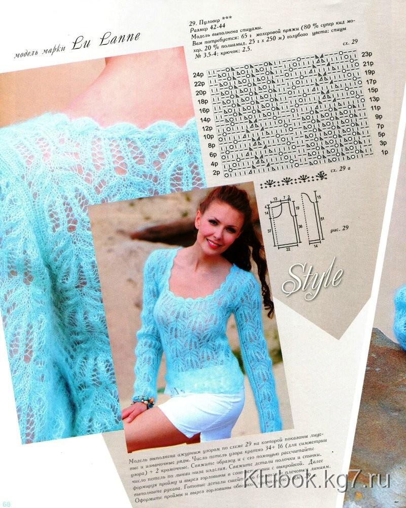 Нежный пуловер из Журнала Мод №558 связан из 650г тонкой пушистой пряжи (80% супер кид мохер, 20% полиамид) длиной 250м/25г спицами №3.5. Размер 42-44.