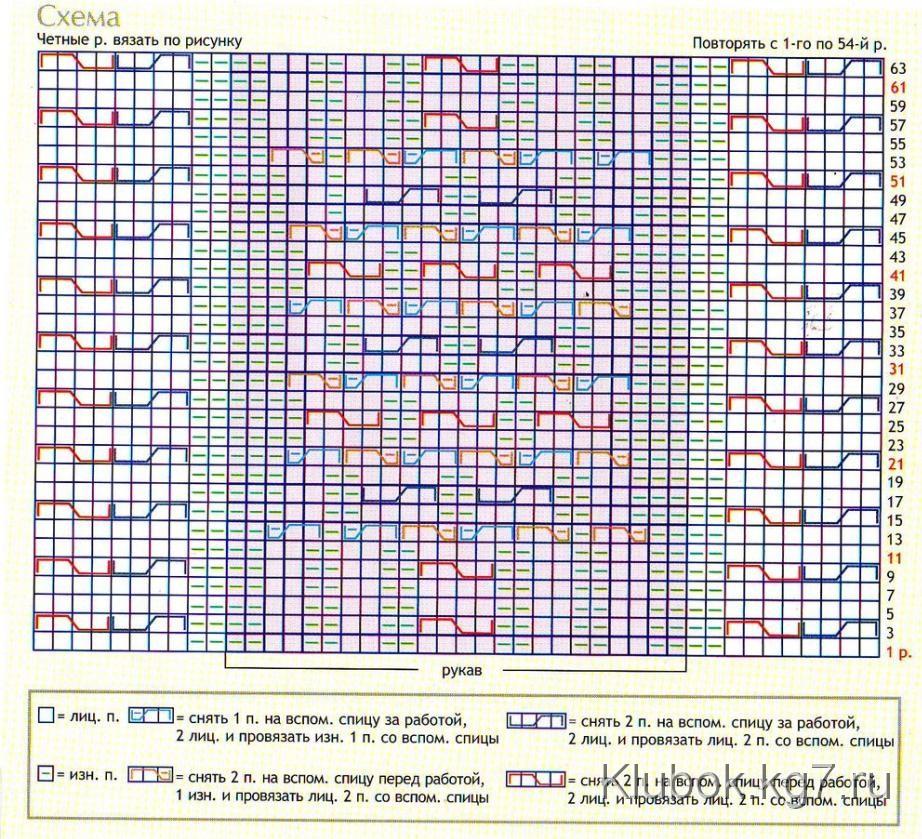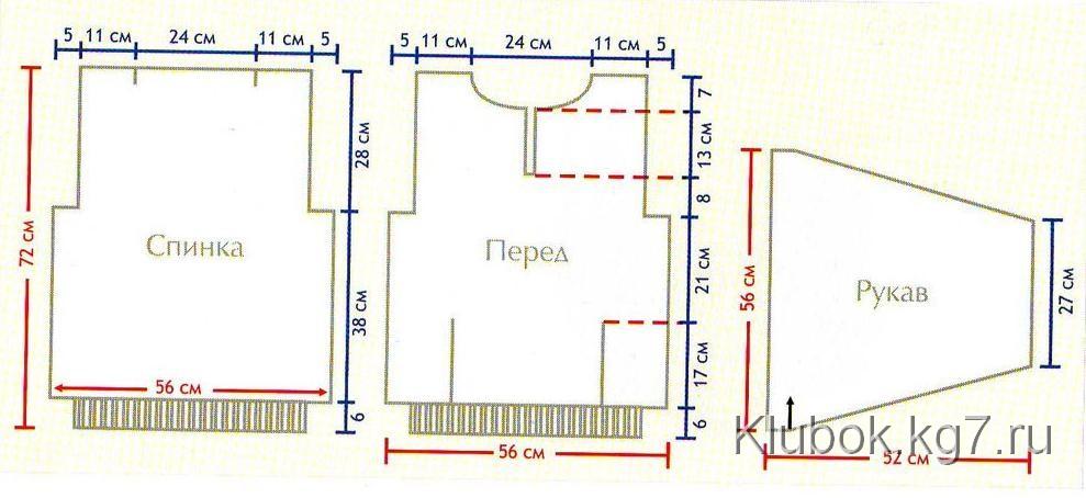 in work, knit 27 cm straight, perform the sleeve slope with short rows in reverse order and bind off sts. The width of the lower edge of the piece is about 27 cm and the upper edge – about 56 cm. Then, along the lower edge, on needles No. 4.5