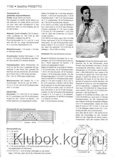 Набрать 81 (83/85)п. спицами № 3,5, вязать первых 3р. узором “узелки”, начать с изн. ряда следующим образом: кром., лиц.п., изн.п. и т.д. по рисунку, закончить ряд лиц. и кром. Далее вязать спицами № 4: кром., 7п. основного узора, 29п. фантазийного узора, 7 (9/11)п. основного узора, 29п. фантазийного узора, 7п. основного узора, кром. Для расширения рукава на высоте 19 (18,5/11)см, т.е. через 54 (52/30)р. фантазийного узора добавить с обеих сторон 1 раз по 1п., затем в каждом 4-м ряду 3х1п. (5?1/9?1) = 89 (95/105)п. Добавленные петли включать в основной узор. На высоте 25(27/25)см, т.е. через 72(78/72)см закрыть для формирования оката рукава с обеих сторон в каждом 2-м ряду 1х3п. и 2х1п., отложить оставшиеся 79 (85/95)п. = 27 (29/27)см. Второй рукав вязать аналогично.