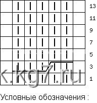 Расширение ромба вяжется смещением 2-х лицевых петель влево и в право от середины ( вправо снимаем за работой 1 изнаночную петлю на доп. спиц., провязываем 2 лицевые, а потом лицевой 1-ну снятую изнаночною. Дальнейшею роботу выполняйте по схеме, так как не всегда изнаночную петлю нужно вязать лицевой.