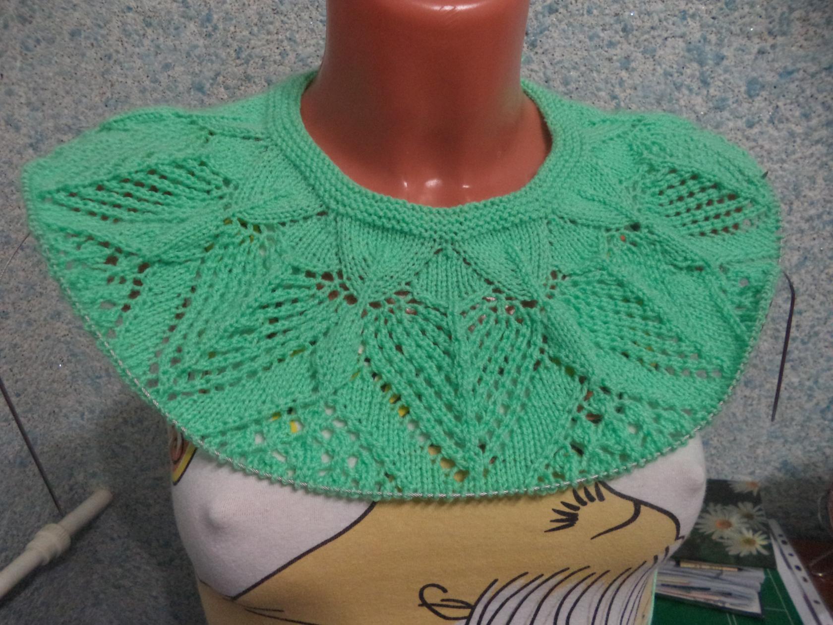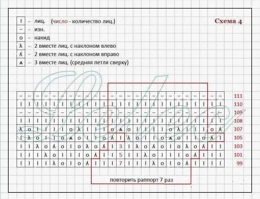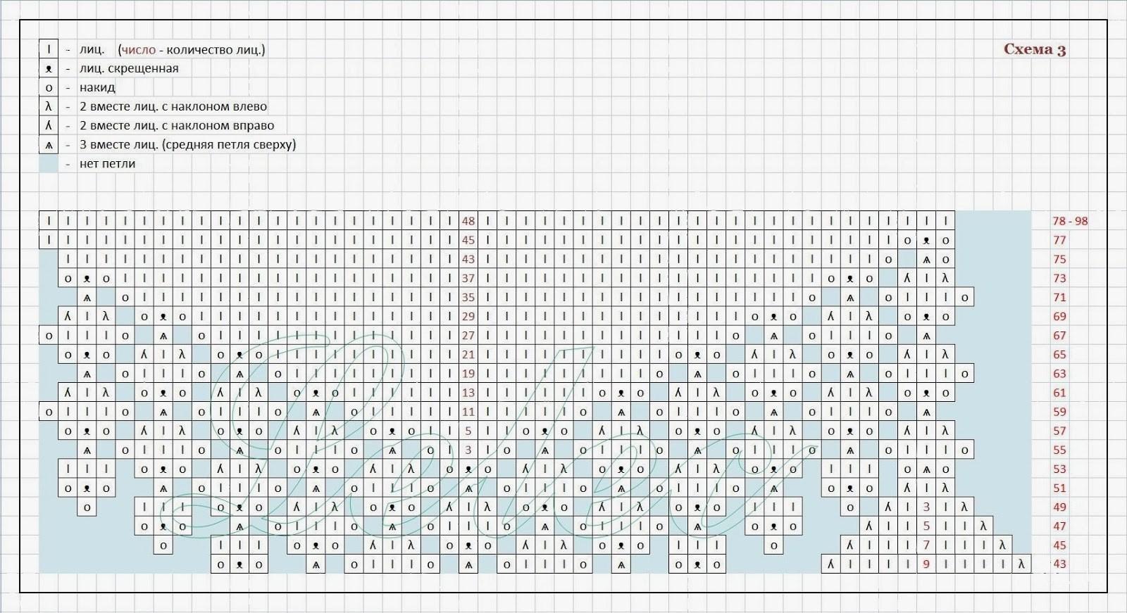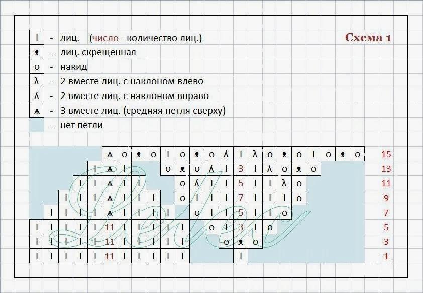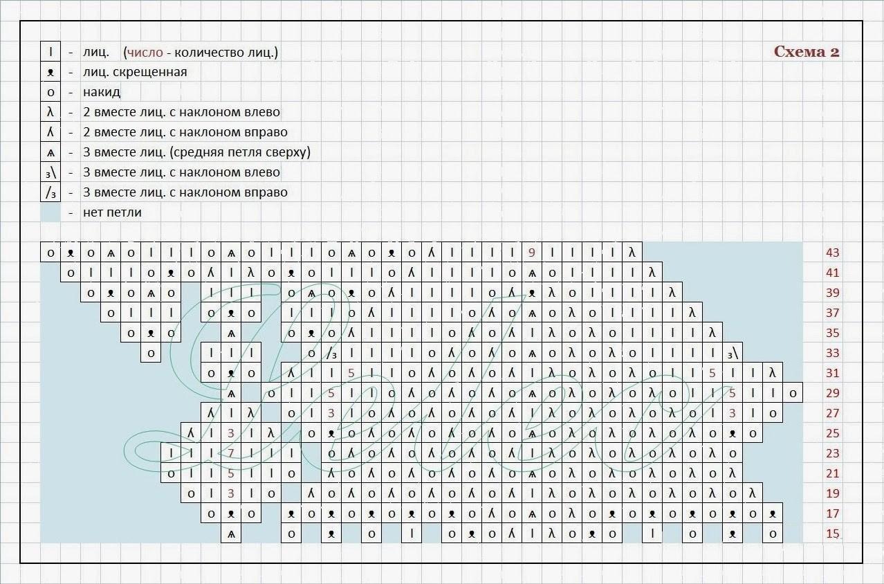 63р: (yo, 3 knit stitches, yo, slip one stitch, knit two together and pass through the slipped stitch) – 2 times, yo, 19 knit stitches, yo, slip one stitch, knit two together and pass through the slipped stitch, yarn over, 3 knit stitches, yarn over, slip one stitch, knit two together and pass through the slipped stitch. Repeat from * to the end of the round.