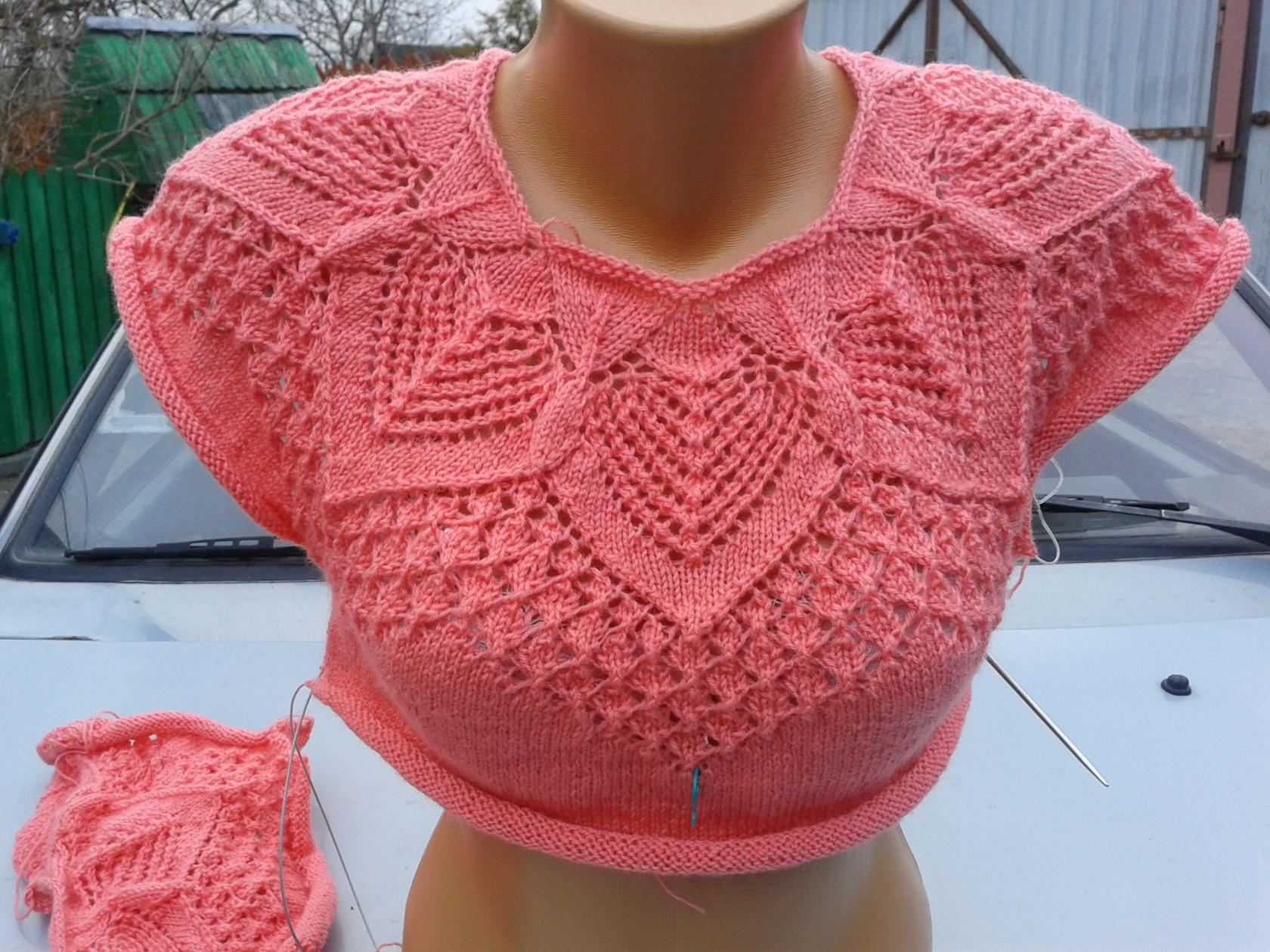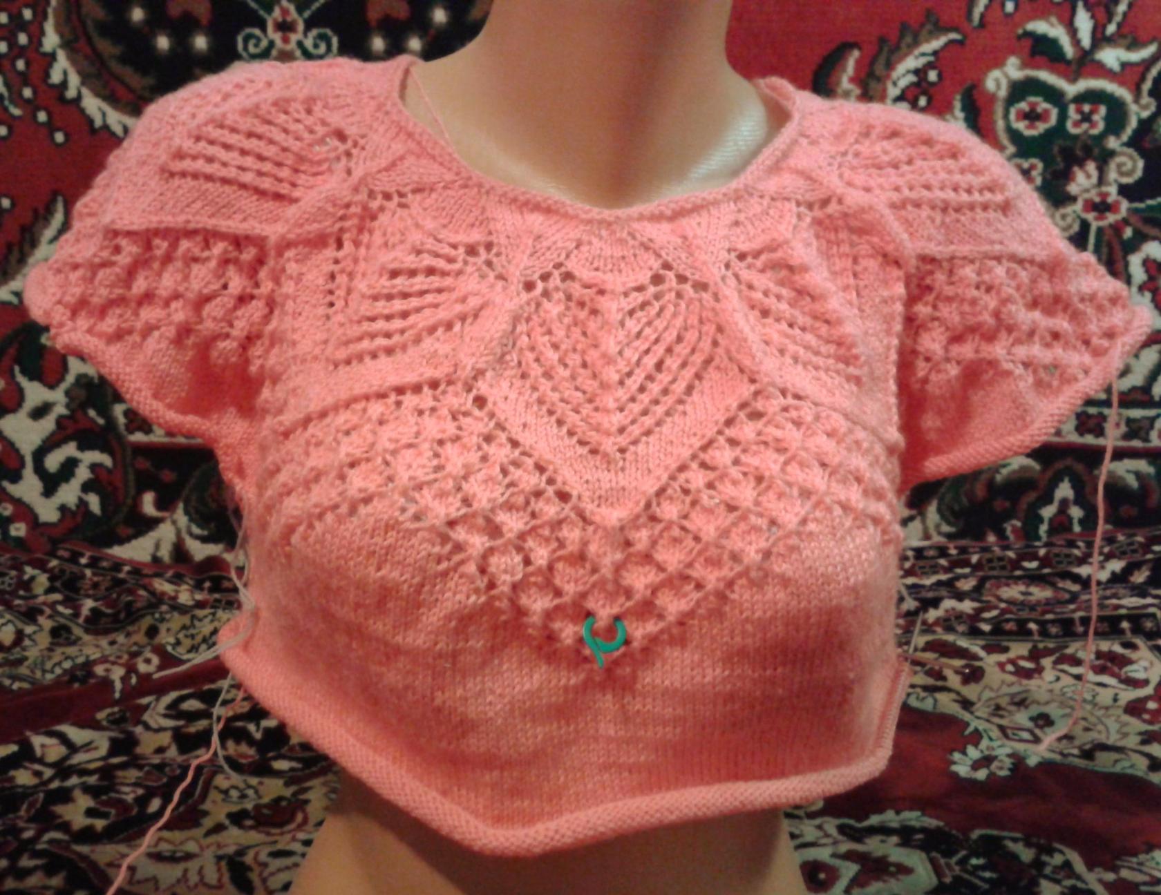 Note that both sizes are knitted absolutely the same, only on needles of different sizes. The blouse is knitted in circular rounds from top to bottom. When knitting, you need to move the markers that designate the beginning of the round and the beginning of the pattern repeat. When the number of stitches becomes larger during knitting, you should switch to longer needles. Description of work