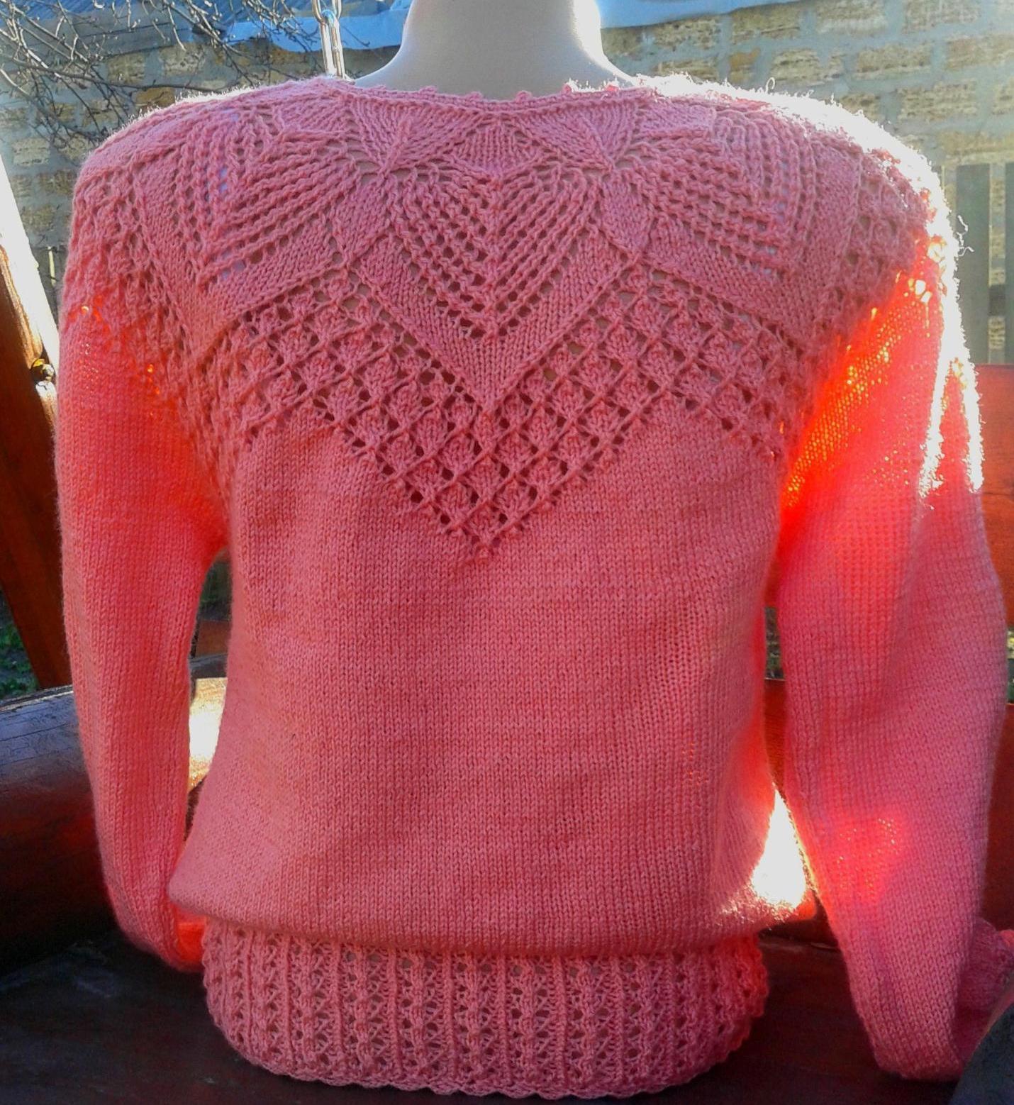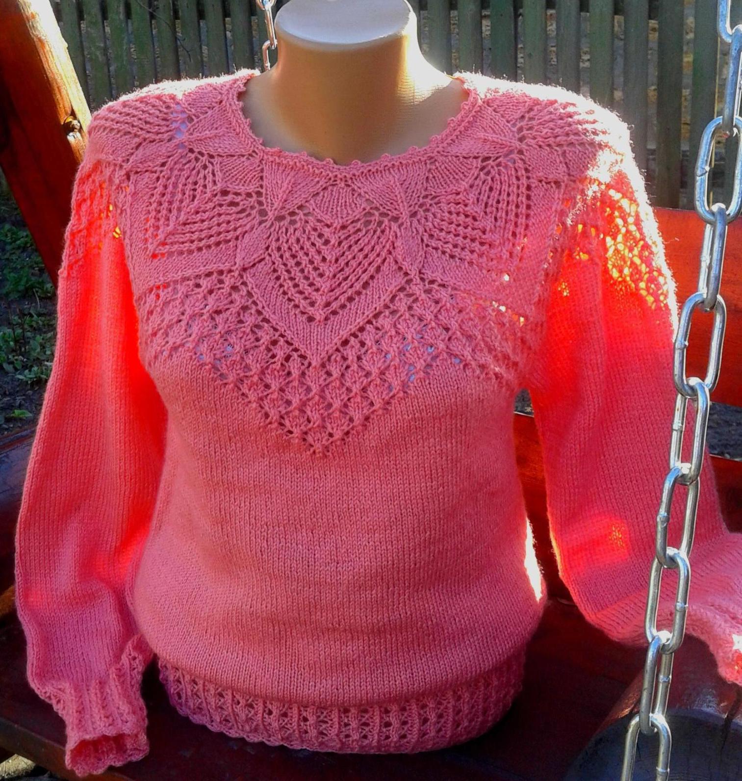 37th round: *2 knit stitches together with a left-leaning slant, 4 knit, yo, 2 knit stitches together with a left-leaning slant, yo, slip 1 stitch, 2 knit stitches together and drawn through the slipped, yo, 2 knit stitches together with a right-leaning slant, yo, 4 knit, 2 knit stitches together with a right-leaning slant, yo, 3 knit, yarn over, 1 knit crossed, yarn over. Repeat from * to the end of the round. Total on needles 224 stitches = 8 repeats of 28 stitches.