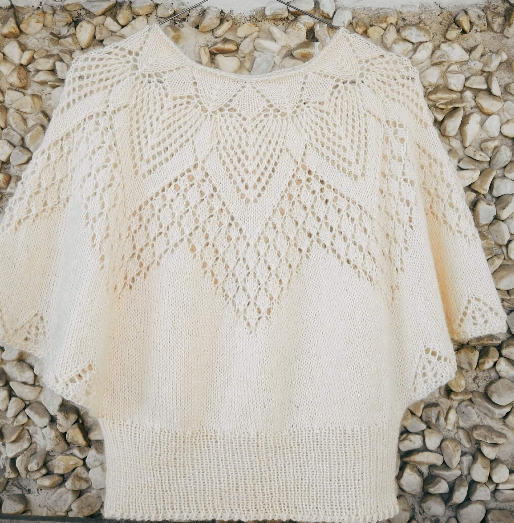 To make the blouse we will need: yarn in white (or simply any pastel shade) color (kid mohair 70%, silk 30%, 420m/50g); circular needles No.4.5 (size S/M) and No.5 (size L/XL); a tapestry needle; markers.