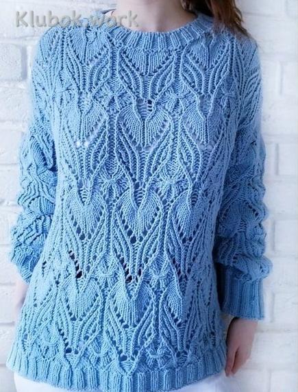 Спицами №3.5 и пряжей контрастного цвета набрать 113(122) п и вязать 1 ряд лиц (в конце работы этот ряд будет срезан), пряжей нужного цвета вязать 1 ряд изн и 6 рядов полой резинкой, продолжить вязать на спицах №4, распределяя петли так: 1 кром * 22 п косой, 18(21) п ажурным узором * повторить еще раз от * до *, 22 п косой, 9(12) п ажуром, 1 кром. На высоте 13 см убавить по 1 п по бокам 2 первых секторов ажура и 1 п справа от последнего ажурного участка. Повторять эти убавления каждые 18(16) рядов 5(6) раз, потом после следующих 14 рядов и 3 раза каждые 2 ряда, убавления располагать друг над другом. Следить, чтобы в ажуре число накидов соответствовало числу протяжек. Закончив убавления для маленького размера, закончатся петли ажура (для большого убавить еще по 1 петле оставшейся от ажурных участков, провязать протяжкой оставшуюся петлю ажура и предыдущую). На высоте 42(46) см для горловины по правой стороне работы закрыть 11 п и продолжить закрывать в каждом 2-м ряду 9 п, 10 раз по 3 п. Одновременно с 4-м(2-м) закрытием для формирования плеча убавлять протяжкой слева перед последними 2 п в каждом 2-м ряду 9(11) раз по 1 м. Выполнив 3-е убавление плеча в след. ряду по лицу убавить 2 п перед последними 21 п, для убавления провязать 2 вместе изн, 1 изн, 2 вместе изн. и в след. ряду убавить еще 2 п над этой убавкой. Для следующего перекрестия косы отложить перед работой петли, провязанные лиц, и провязать изн оставшиеся, потом отложенные провязать лиц. Закончив убавления плеча примерно на высоте 50(54) см закрыть оставшиеся 5 п.