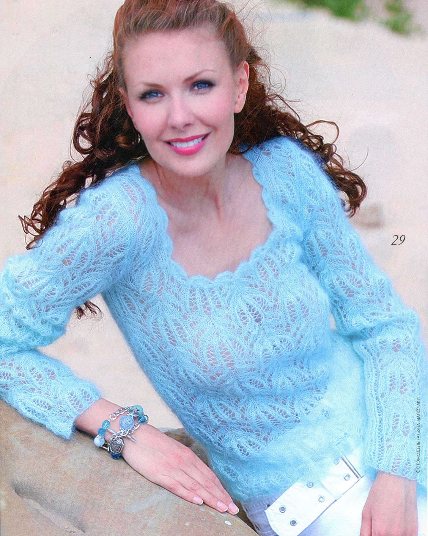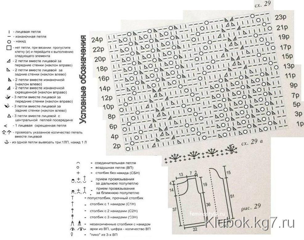 The pullover is knitted with a lace pattern according to scheme 29, which shows the knit and purl rows. The number of stitches in the pattern is a multiple of 34 + 16 (for symmetry) + 2 edge stitches. Knit a sample and use it to calculate the number of stitches along the bottom edge of the garment. Knit the front and back pieces, forming the armholes and neckline according to the pattern. Next, knit the sleeves. Sew the finished pieces of the pullover along the side and shoulder seams. Finish the armholes and neckline with a crochet edging according to scheme 29 a.