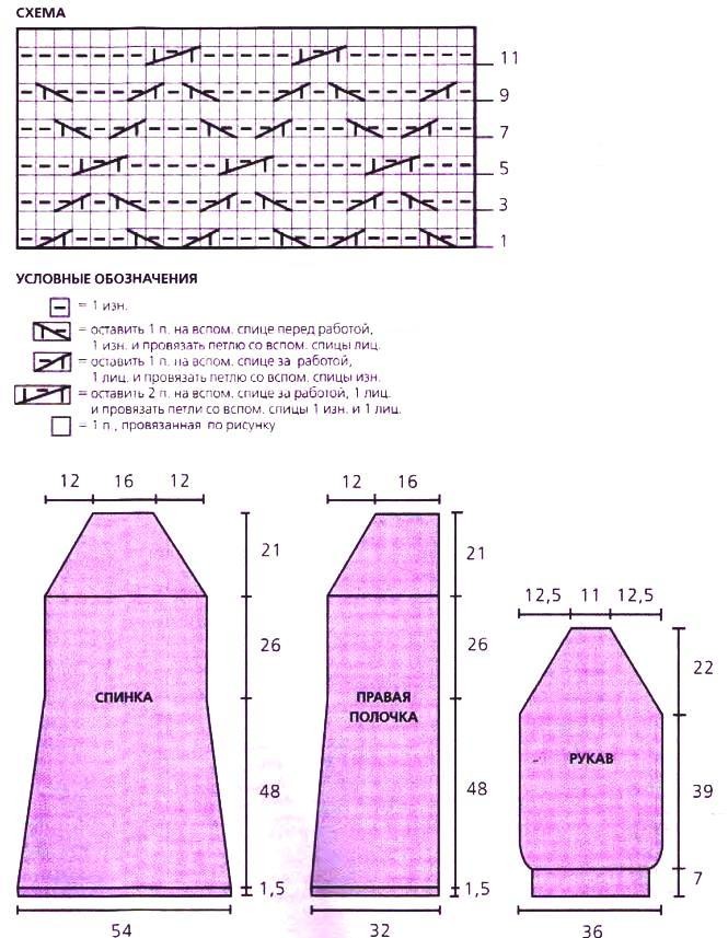 Рукава: на спицы № б набрать 34 п. и связать 2 р. двойной резинкой, 8 р. резинкой 2/2 и 2 р. двойной резинкой (всего 7 см). Перейти на спицы № 8 и вязать основным узором, равномерно прибавив в 1-м р. 1 х 15 п. Через 39 см от резинки вязать на всех петлях резинкой 2/2 (начиная с 2 лиц.), равномерно убавив в 1-м р. 1 х 3 п., при этом выполнитьскосы реглана, как для спинки. Через 22 см от начала скосов реглана отложить оставшиеся 14 п.