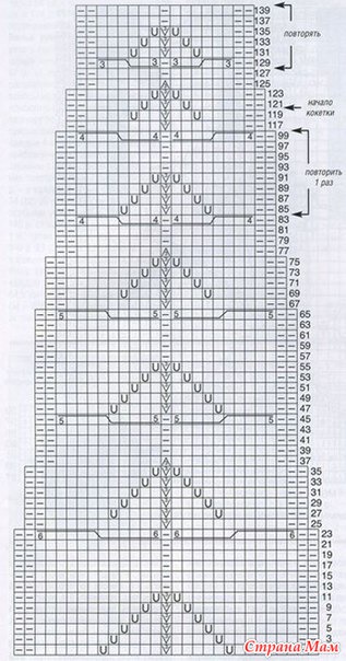 Со 120-го р. вязать круговыми рядами. Лиц. р. схемы станут нечетными круговыми рядами, в четных круговых рядах все петли вязать по рисунку, накиды вязать лиц.