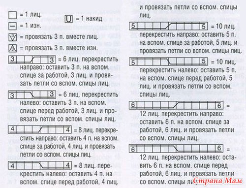 Узор из кос (сначала из 29 п.): вязать по схеме, на которой приведены только лиц. р., в изн. р. все петли вязать по рисунку, накиды вязать изн.