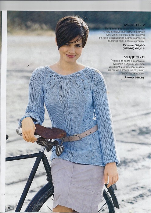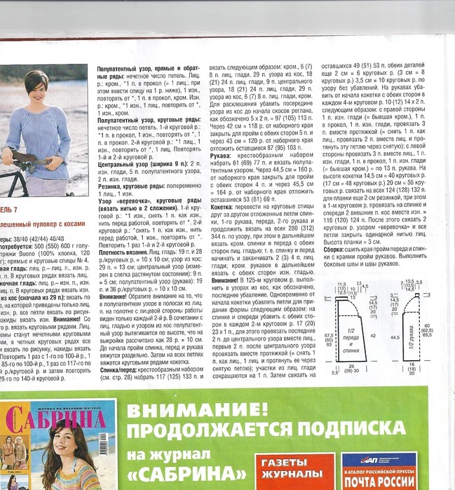 Внимание! Обратите внимание на то, что в полупатентном узоре в полосах из лиц. п. на полотне с лицевой стороны работы виден только каждый 2-й р. В сочетании с лиц. гладью и узором из кос полупатентный узор вытягивается по высоте, что на выкройке рассчитано как 28 р. = 10 см. До начала пройм спинка, перед и рукава вяжутся раздельно. Затем на всех петлях вяжется круговыми рядами кокетка.
