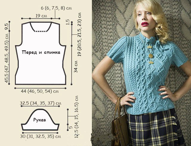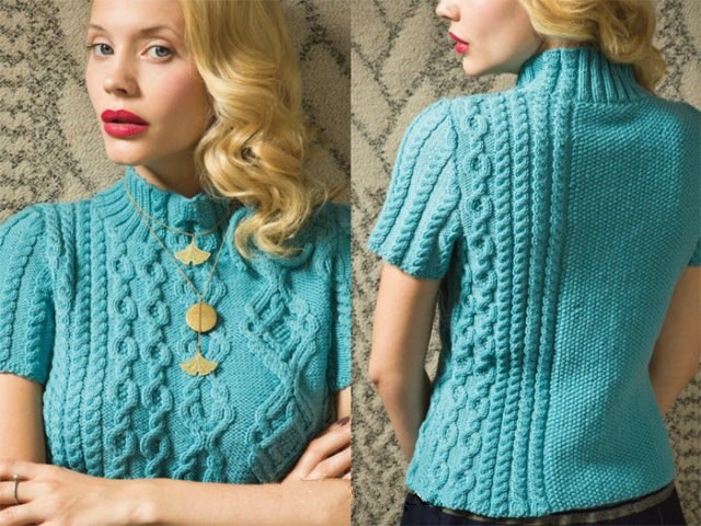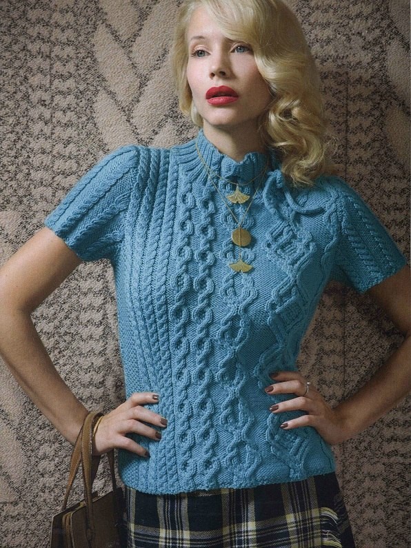 Красивый пуловер с короткими рукавами от Фионы Эллис связан спицами великолепным узором из аранов.