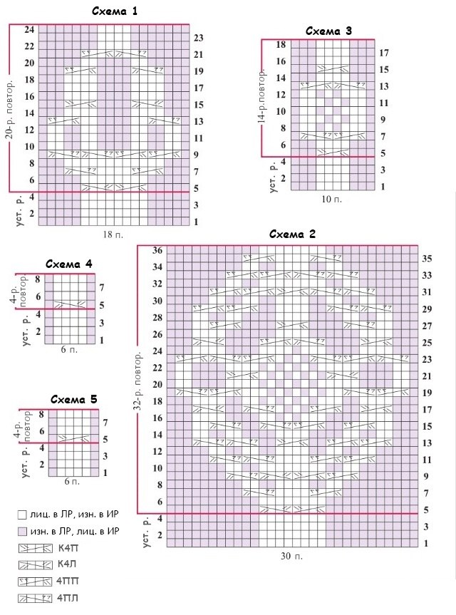 Условные обозначения. ОП - укороченные ряды (ИНСТРУКЦИЯ); К4П - снять 2 п. на вспом. спицу за работой, 2 лиц., затем 2 лиц. со вспом. спицы; К4Л - снять 2 п. на вспом. спицу перед работой, 2 лиц., затем 2 лиц. со вспом. спицы; 4 ПП - снять 2 п. на вспом. спицу за работой, 2 лиц., затем 2 изн. со вспом. спицы; 4 ПЛ - снять 2 п. на вспом. спицу перед работой, 2 изн., затем 2 лиц. со вспом. спицы. Узор "рис"(нечетное число петель): 1-й р. (ЛС): 1 лиц., * 1 изн., 1 лиц.; повторять от * до конца ряда; 2-й р. (ИС): лицевые петли вязать изнаночными, изнаночные петли вязать лицевыми. Повторять 2-й ряд.