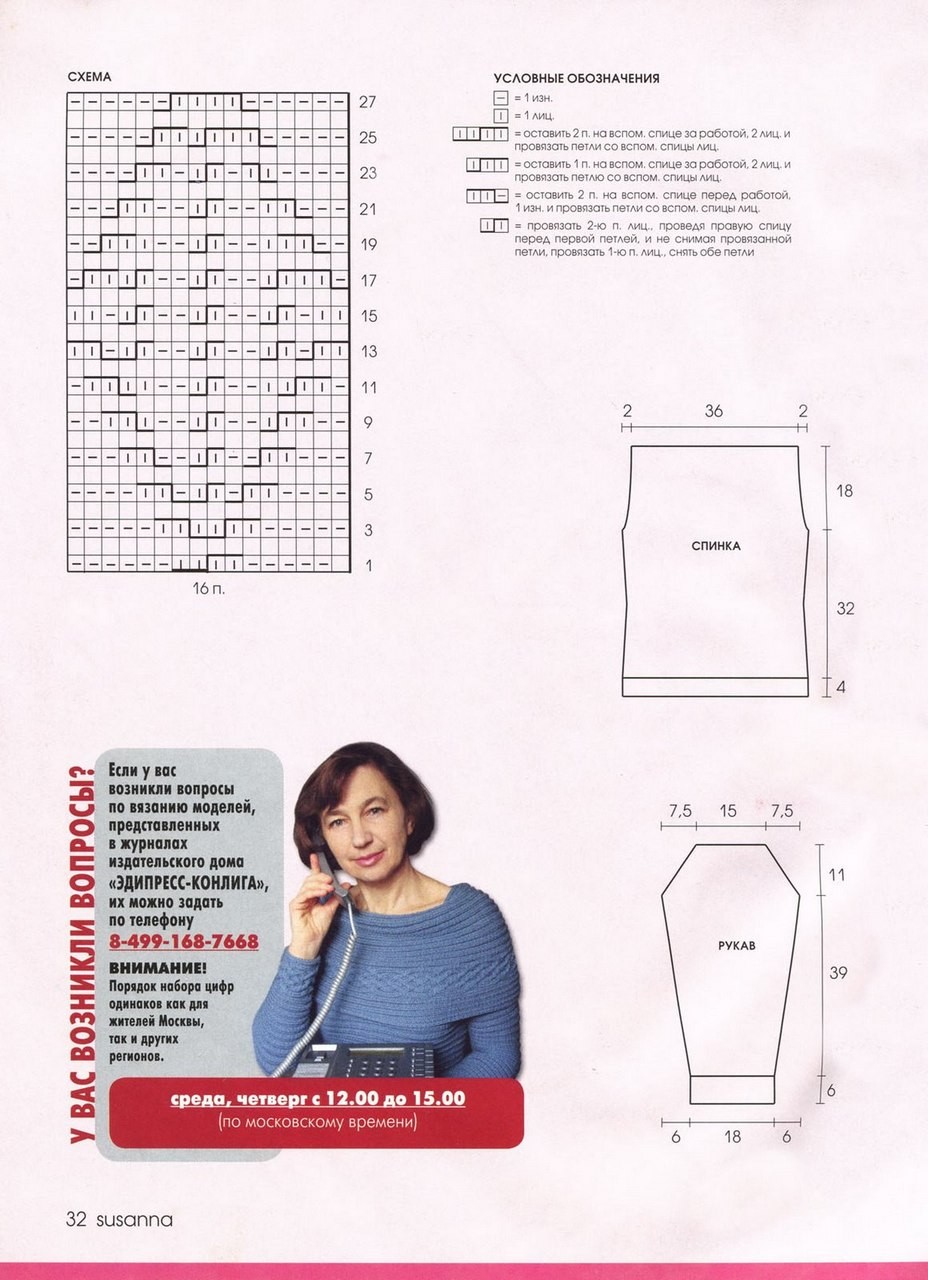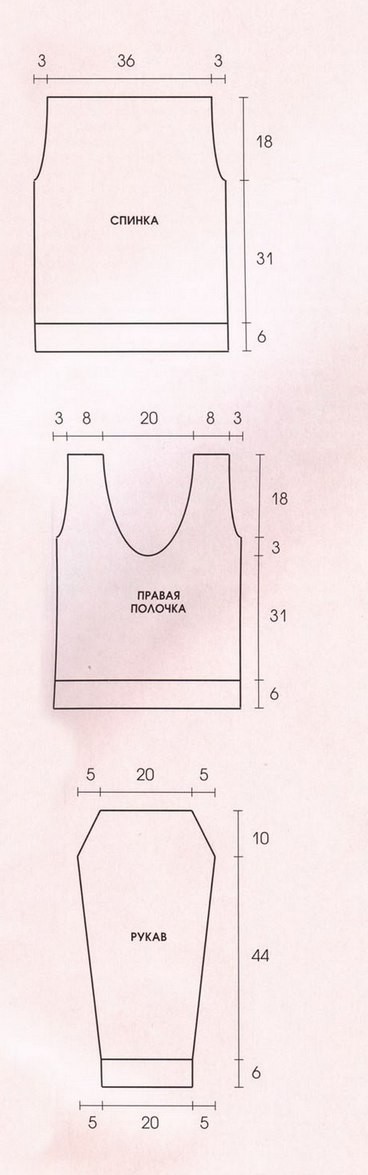 части раздельно, убавляя с обеих сторон от центра за крайними 3 п. в каждом 2-м р. 22 х 2 п. Через 36 см от наборного края закрыть оставшиеся с обеих сторон 4 п.