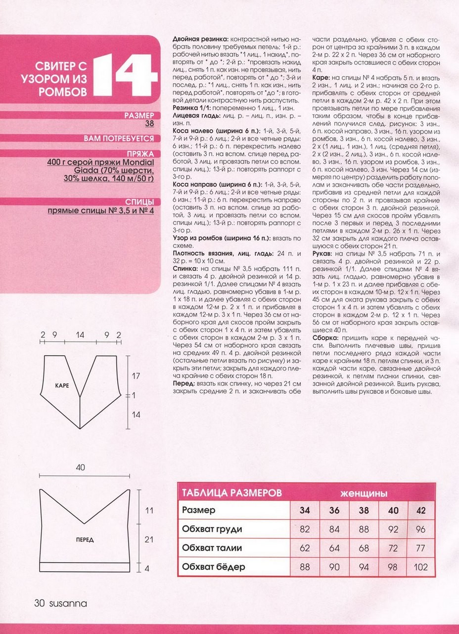 Каре: на спицы № 4 набрать 5 п. и вязать 2 изн,, 1 лиц, и 2 изн,: начиная со 2-го р. прибавлять с обеих сторон от средней петли в каждом 2-м р, 42 х 2 п. При этом провязывать петли по мере прибавления таким образом, чтобы в конце прибавлений получился след. рисунок: 3 изн,. 6 п. косой ноправо, 3 изн.. 16 п. узором из ромбов, 3 изн., 6 п. косой налево, 3 изн., 2 х (1 лиц., 1 изн.), 1 лиц. (средняя петля), 2 х (2 изн,, 2 лиц.), 3 изн., 6 п. косой налево, 3 изн., 16 п. узором из ромбов, 3 изн., 6 п. косой налево, 3 изн, Через 14 см (измеряя по центру) разделить работу пополам и заканчивать обе части раздельно, прибавив из средней петли для каждой стороны по 2 п. и провязывая крайние с обеих сторон 3 п. двойной резинкой. Через 15 см для скосов пройм убавлять после 3 первых и перед 3 последними петлями в каждом 2-м р. 26 х 1 п. Через 32 см закрыть для каждого плеча оставшуюся с обеих сторон 21 п.