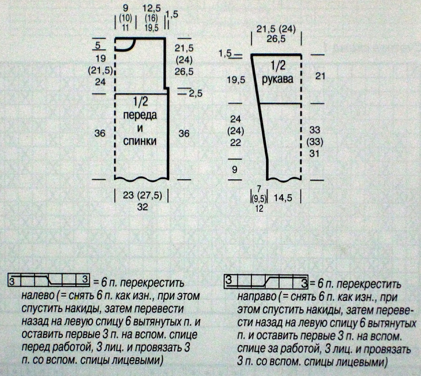 1. 6 п. перекрестить налево (= снять 6 п. как изн., при этом спустить накиды, затем перевести назад на левую спицу 6 вытянутых п. и оставить первые 3 п. на вспом. спице перед работой, 3 лиц. и провязать 3 п. со вспом. спицы лицевыми)