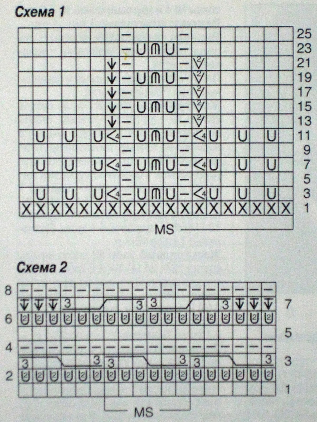Плетеный узор: число петель кратно 6 + 2 кром. Вязать по схеме 2, на которой приведены лицевые и изнаночные ряды. Начать с 1 кром., петли перед раппортом, повторять раппорт, закончить петлями после раппорта и 1 кром. Повторять с 1-го по 8-й р.