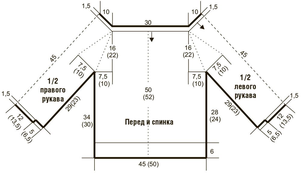 Отметить, соответственно, 3 п. линии реглан, при этом 1-я петля — последняя петля предыдущего кругового ряда, 29 п. левого рукава, 3 п. линии реглан, 45 п. переда, 3 п. линии реглан, 29 п. правого рукава, 3 п. линии реглан, 45 п. спинки.