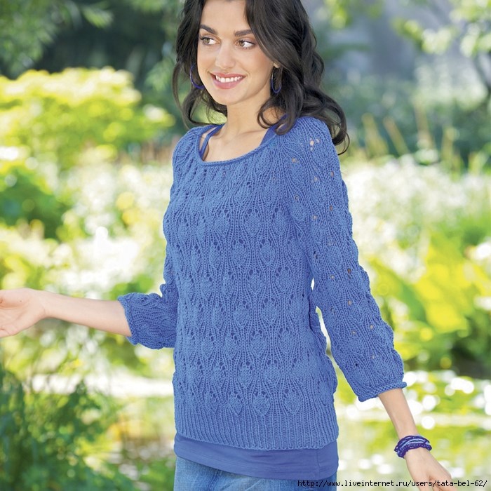 Джемпер с округлой горловиной и рукавами 3/4 связан из хлопковой пряжи круговыми рядами красивым ажурным узором.