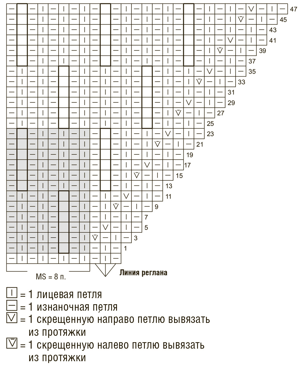 В таком распределении петель вязать спицами №5 ажурным узором; у рукавов в начале раппорт повторить 3,5 раза, на спинке и переде, соответственно, — по 5,5 раз. Прибавки для скосов реглан помечены по правому краю схемы вязания, так рационально прибавлять с обеих сторон по 3 петли.