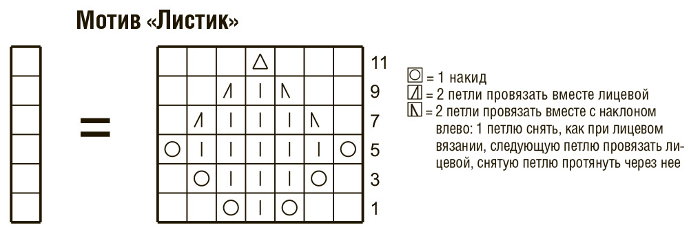 Вязать согласно схеме, на ней даны нечетные (= лицевые) ряды, в четных (= изнаночных) рядах петли провязывать по рисунку, накиды провязывать изнаночными.