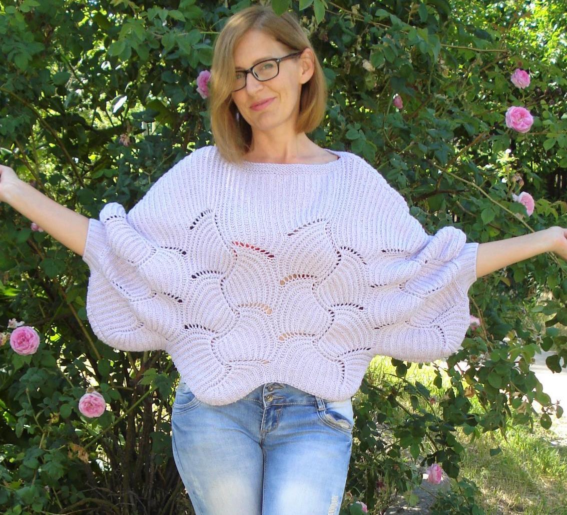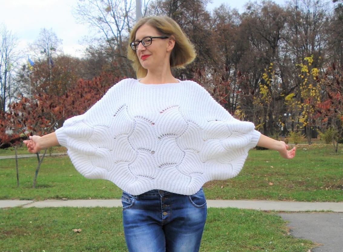 Количество петель считайте сами соотвественно вашей плотности – это должно быть 4 или 5 раппортов, по краям можно добавит по несколько петель, если не получается желаемая ширина. У меня получилось 4 раппорта (160п),по 10 петель с каждой стороны ровной резинкой+1 петля для симметрии, чтобы ряд начинался и заканчивался лицевой, и 2 кромочные +183 петли. Вы смотрите сами что вам нужно – я вязала с выходом на длину «рукава» 3/4, учитывая, что потом мы привяжем еще по 7 см резинку. Здесь тоже варианты. Вы можете связать поуже, до локтя, с рукавом ¾ или до запястья, по Вашему желанию. Я считаю, что худеньким девочкам красиво будет и с широким, от запястья до запястья пончо, а вот 48 размер и больше – нужно уже более короткие рукава, чтобы не выглядеть капустной.