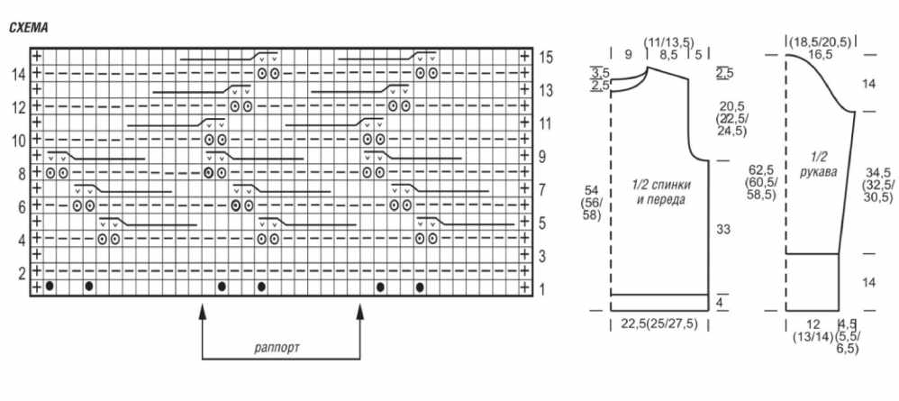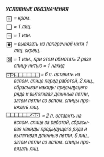 Узор с косами: число петель кратно 12 + 2 кром. Вязать по схеме, на которой приведены лиц. и изн. р. Начать с петель перед раппортом. 12 п раппорта между стрелками повторять, закончить петлями после раппорта. Выполнить 1-15-й р. 1 раз. затем 4-15-й р. повторять.