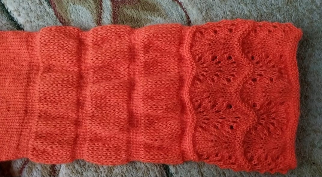 Здесь идея просто в смене размера спиц. Сначала вяжу самой мелкой, 1.5, а потом крупной 7. А волна получается сама по себе, петли прибавлять не надо. рукав абсолютно ровный. На кайме рукава спицы 5 взяла, а то получилось бы совсем широко