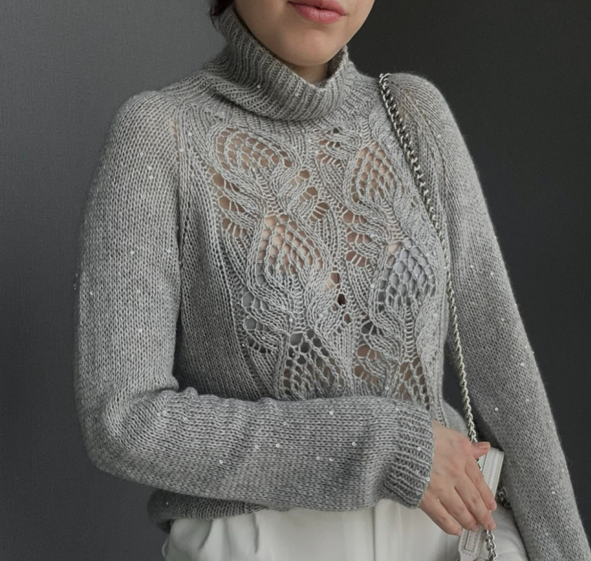 18–ый и все четные круговые ряды вязать по узорам, провязывая накиды, которые вязались до и после петель регланных линий лицевой петлей за заднюю стенку.