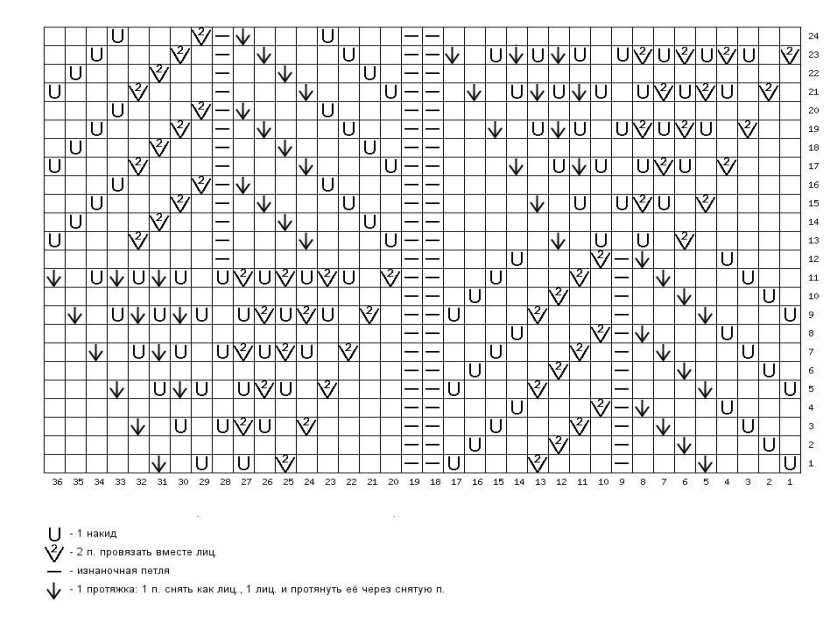- «жгут левый» (5 петель): 1,2,3,4,5 ряд – все петли лицевые, 6 ряд: 4 петли снять на вспомогательную спицу за работой, 1 петлю провязать лицевой, 4 петли перенести на левую спицу и провязать лицевыми петлями. Повтор с 1 – го ряда; - японский узор: пустая клеточка – лицевые петли, в ширину вязать 1 раппорт узора. Раппорт узора 36 петель в ширину, 24 ряда в высоту.