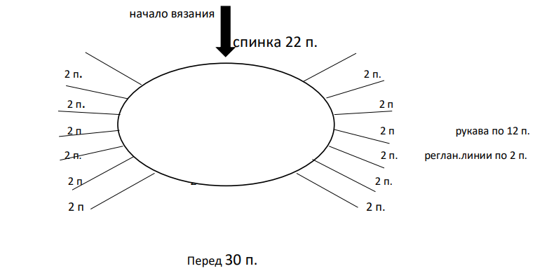 М (отметка начала вязания), 11 петель (1/2 часть спинки), М, 2 петли, М, 12 петель (рукав), М, 2 петли, М, 30 петель (перед), М, 2 петли, М, 12 петель (рукав), М, 2 петли, М, 11 петель (1/2 часть спинки).
