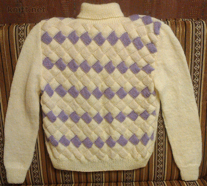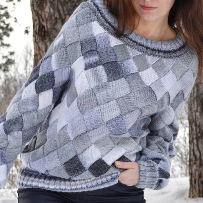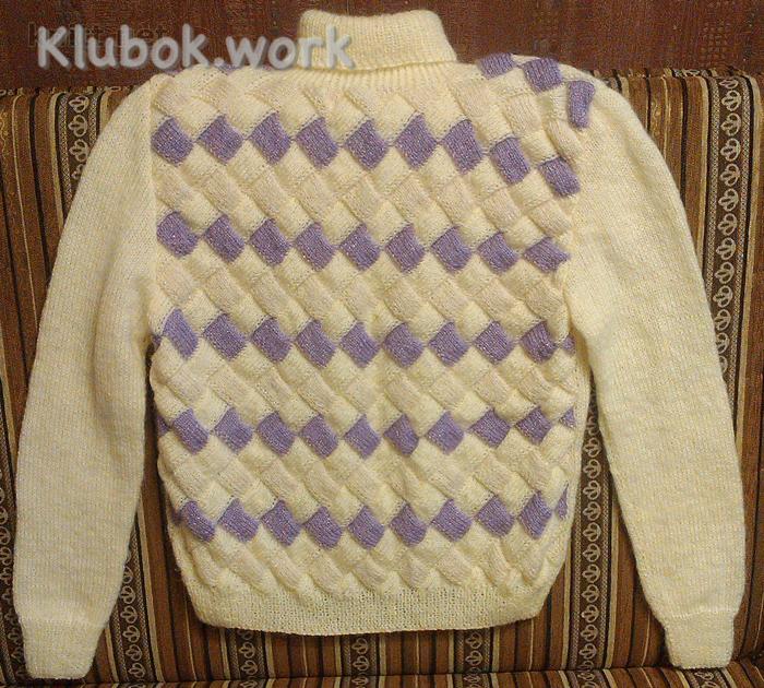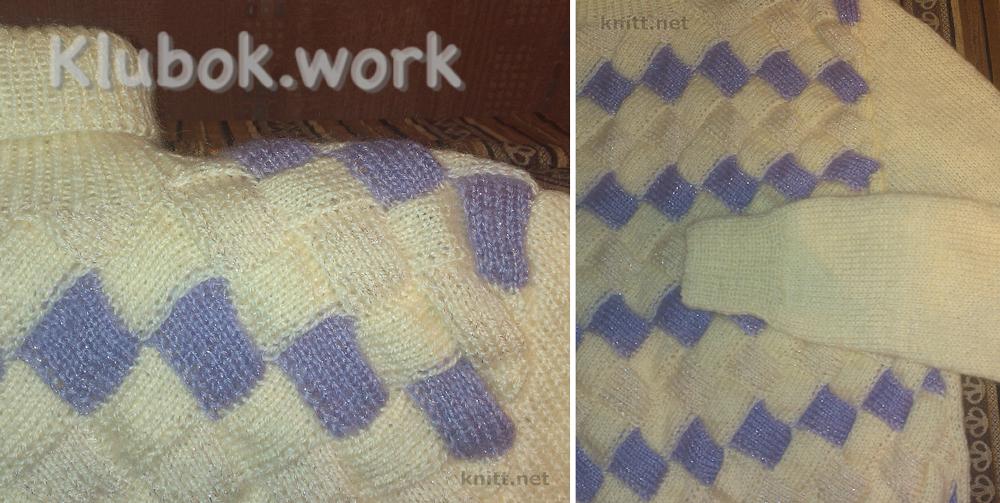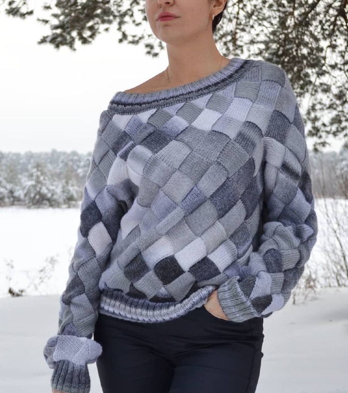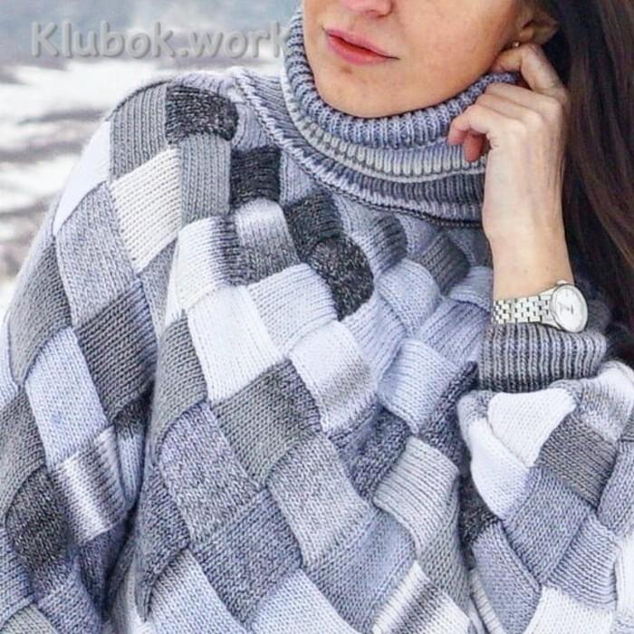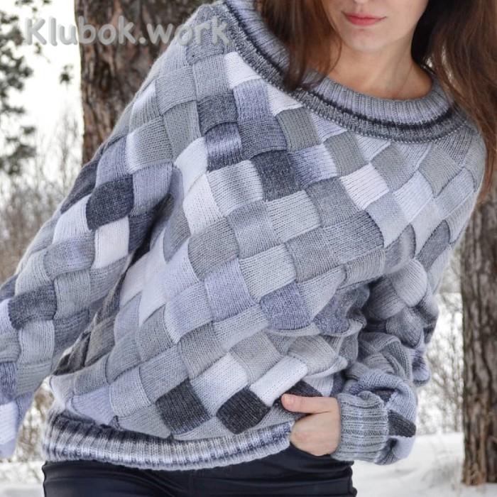 Женский свитер спицами в технике энтерлакKlubokhttp://klubok.work/1/3/8772/Klubokhttps://klubok.work/css/image/top-logo-en.pngСвитер серого цвета связан автором модели strelnikova_lena.Описание модели предложено из пряжи двух цветов,белой и сиреневой.Для образца первой модели используется пряжа секционного крашения.