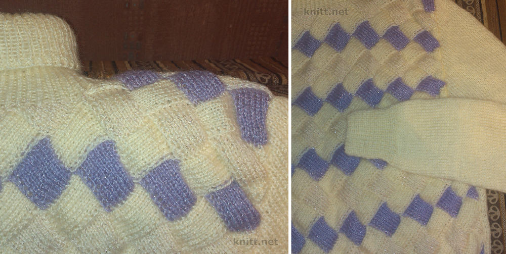 Таким образом, чередуя (А) и (В) ряды (цветовую гамму см. на картинке: прямоугольник белого цвета, прямоугольник белого цвета с люрексом, прямоугольник сиреневого цвета с люрексом ), вяжете перед до проймы – всего 12 рядов, последний ряд – белый. В последнем ряду прямоугольников убавьте с каждой стороны по 8 п. Далее вяжите ещё 8 рядов прямоугольников. В последнем 8-м ряду Вы делите изделие на 3 части и среднюю часть закрываете треугольником (см. вывязывание горловины), оставшиеся части – это плечи.