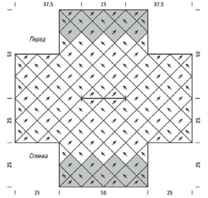 Плотность: лицевая гладь: 16 п. и 20 р. = 10 х 10 см. По диагонали прямоугольник шириной 12,5 см.