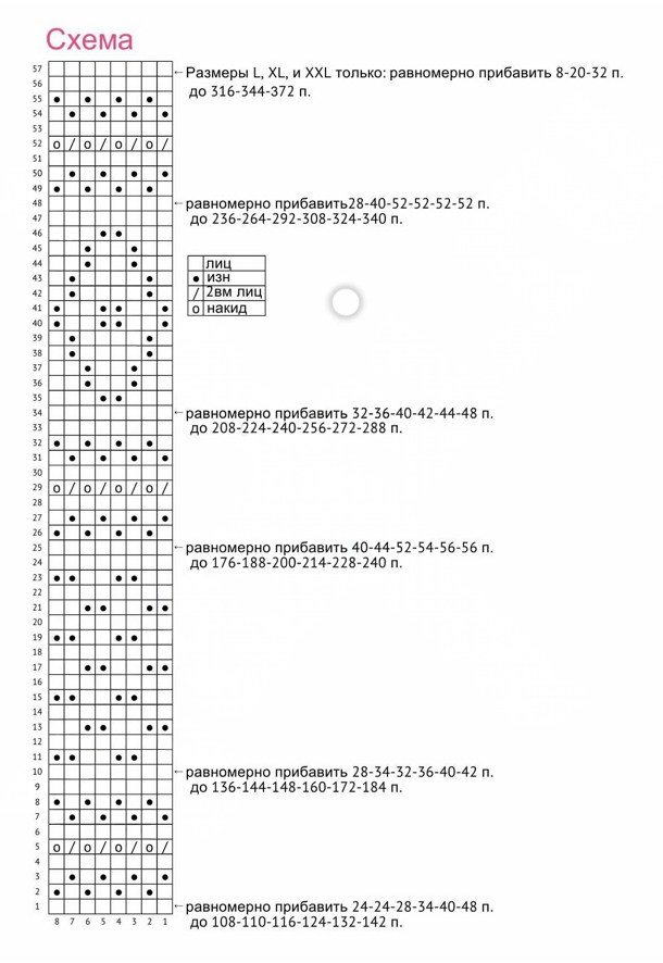 Закінчивши додавання, продовжувати в’язати без додавань. Ряди з 1 по 47 повторюються, але для деяких розмірів у схемі більше рядів, ніж 47. В’язати до висоти кокетки ок.