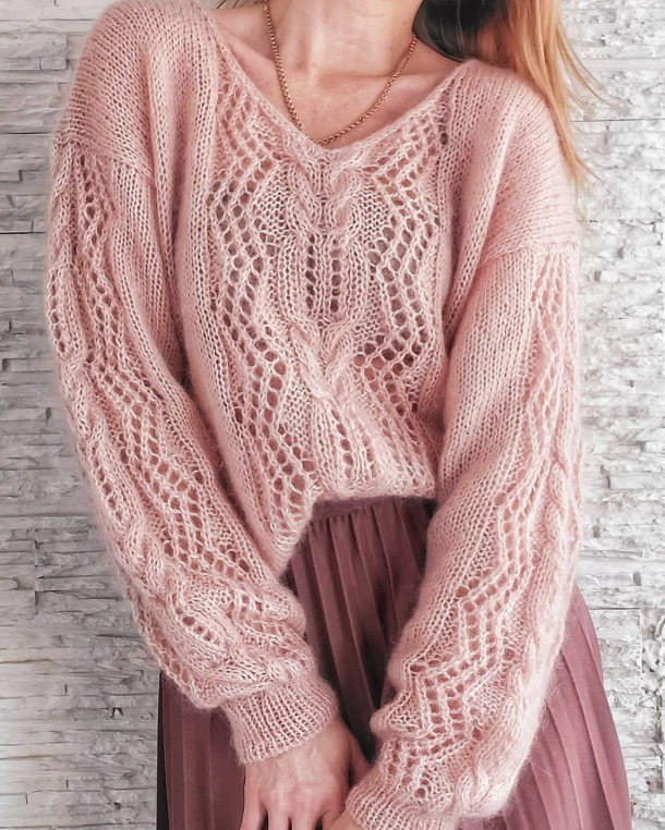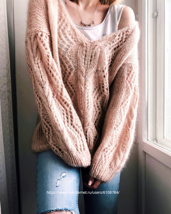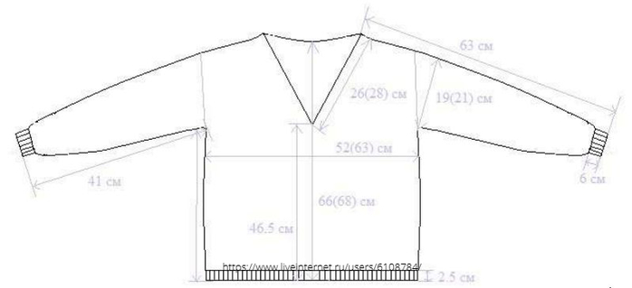 Примечание: Перед со спинкой и рукава свитера вяжутся раздельно круговыми рядами. Затем детали соединяются трикотажным швом.