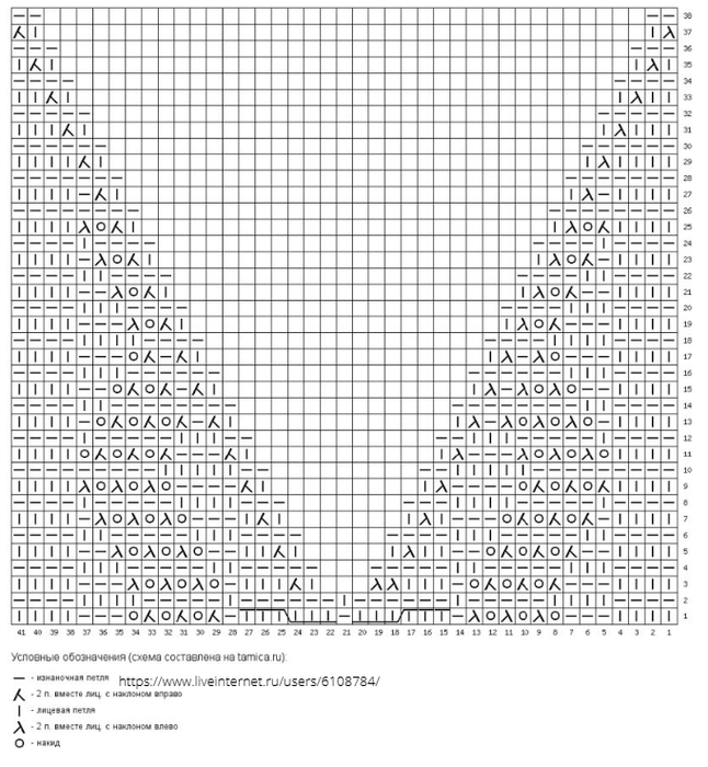 Для удобства выполнения убавлений линий горловины вязать в соответствии со Схемой «Вырез горловины» для двух сторон, в которой 3- ий ряд Схемы равен 81-ому общему лицевому ряду.