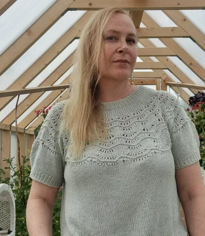 Work neck edge and yoke in the round on circular needle from mid back, work top down. When yoke is done, divide stitches for body and sleeves. Work body down wards in the round on circular needle while putting the sleeves aside. Then work sleeves downwards in the round on needle.