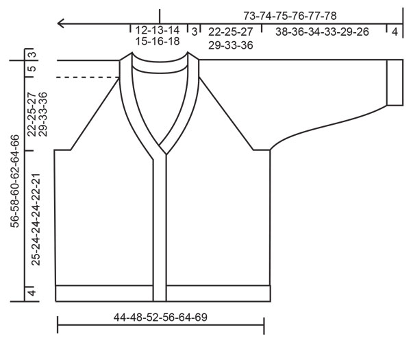 Bottom buttonhole should be approx. 2 cm from bottom edge and top buttonhole where V-neck begins. Place the remaining 3 buttonholes evenly, approx. 8-8-8-7½-7½-7½ cm between each buttonhole.