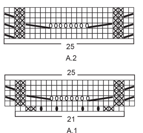 Insert 4 marker threads in piece as follows (without working the stitches): Count 3 stitches (= front piece), insert 1 marker thread in next stitch, count 21 stitches (= sleeve), insert 1 marker thread in next stitch, count 18-20-22-24-26-28 stitches (= back piece), insert 1 marker thread in next stitch, count 21 stitches (= sleeve), insert 1 marker thread in next stitch, 3 stitches remain on row after last marker thread (= front piece). Then work in stocking stitch on stitches on front pieces and on back piece, and A.1 (= 21 stitches) over stitches on each sleeve, AT THE SAME TIME on first row from right side increase for RAGLAN in every transition between body and sleeves – read explanation above. When A.1 has been worked 1 time vertically continue with A.2 (= 25 stitches) over stitches in A.1 and continue increase for raglan every other row (i.e. on every row from right side) until increase has been done 22-25-27-29-33-36 times in total on each side of the 4 stitches with marker threads. Now continue increase on back piece and on front pieces 2 more times (do not increase on sleeves, increase has been done 24-27-29-31-35-38 times on back piece/front pieces). AT THE SAME TIME on 6th row (i.e. on 3rd row from right side) increase for V-NECK in each side towards mid front – read explanation above, as follows: Increase every 6th row 4-5-6-7-8-9 times, every 4th row 3 times in total (= 7-8-9-10-11-12 stitches in total increased in each side towards mid front). REMEMBER THE KNITTING TENSION!
