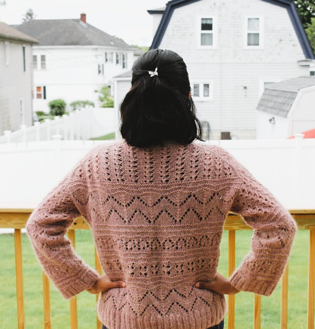 The top of the back piece is worked back and forth on circular needle as far as the armholes. Stiches are knitted up along each shoulder, increases made for the neck and the front piece worked back and forth on circular needle as far as the armholes. The front and back pieces are joined and the body is continued in the round on circular needle. Stiches are knitted up around the armholes and the sleeves worked back and forth to start with, then continued in the round with short circular needle/double pointed needles. The neck is worked in the round to finish.