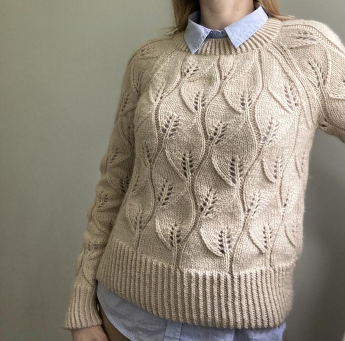 The Solandra sweater is knit from the bottom up in circular rows. First, knit the body section of the pullover to the underarms, a ribbing band is knit before starting the pattern, then the body of the pullover is knit according to the chart. Then set the body stitches aside and knit the sleeves, mirroring the pattern and making even increases to shape the sleeve. The body and sleeve stitches are joined and the yoke is formed with decreases for the raglans until the neckline is formed with short rows. The neckline band is knitted in ribbing, hiding the holes at the underarms. Finally, the pullover is blocked to relax the fabric and smooth out the pattern.