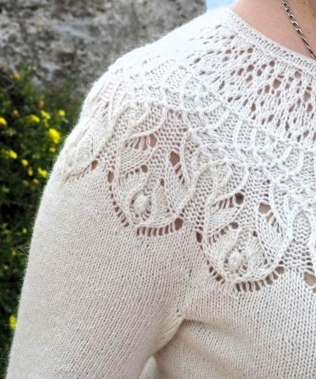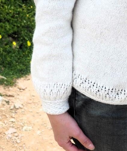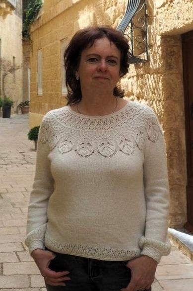 Джемпер Мальта вяжется по кругу сверху вниз без швов. Рукава вяжутся по кругу. При вязании кокетки используются укороченные ряды. В описании представлены два варианта рукава: длинный с манжетой (как на фото) и произвольной длины с ажуром по низу.