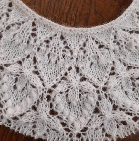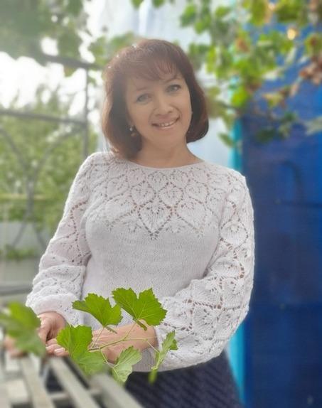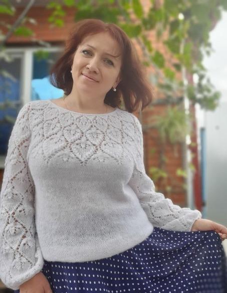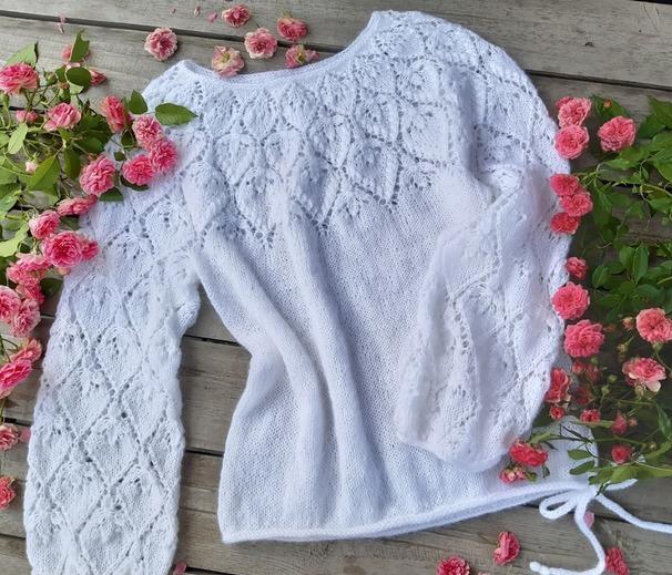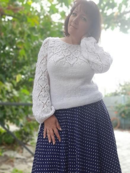 Джемпер свободного силуэта, не приталенный, Круглая кокетка сверху, росток на спинке сразу после горловины, рукава связаны ажурным узором, края обработаны ай-кордом. Связан круговыми рядами, без швов.