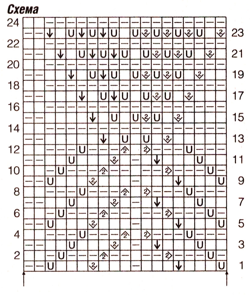 Узор 3: ажурный узор (число петель кратно 19 + 17 п.) = вязать согласно схеме. На ней даны лицевые и изнаночные ряды. Постоянно повторять раппорт из 19 п. между стрелками и закончить первыми 17 п. раппорта.