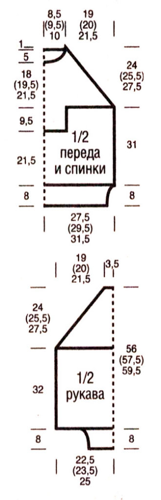 Через 31 см = 78 р. от нижней планки распределить петли следующим образом и одновременно начать вязать регланные скосы: кромочная, 2 п. провязать вместе с наклоном влево, 5 (0) 4 п. узора 2, выполнить 1 раз последние 2 (10) 10 п. раппорта, повторить раппорт 4 раза, закончить первыми 0 (8) 8 п. раппорта, 5 (0) 4 п. узора 2, 2 п., провязанными вместе лицевой и 1 кромочной = 92 (98) 106 п. Затем подчеркнуто убавить с обеих сторон для регланных скосов в каждом 2-м р. еще 31 (33) 36 х 1 п.