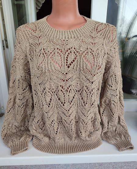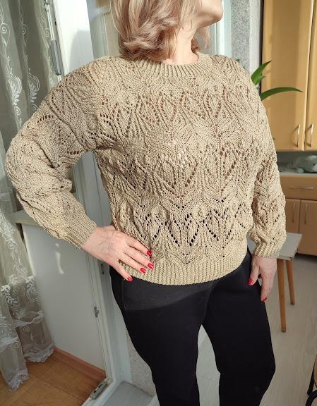 Резинка выполнялась обычным набором, а горловина закрывалась иглой, что позволило добиться аккуратного фабричного края. Рукава по просьбе заказчицы были слегка расширены к пройме: для резинки набиралось 44 петли, в последнем ряду количество увеличивалось до 83, что дало ровно 4 раппорта. Благодаря упругости узора результат получился гармоничным.