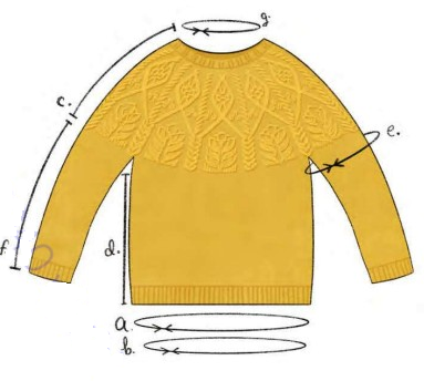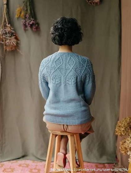 Примечания: Пуловер Epoch вяжется без швов сверху вниз, с круглой кокеткой, начиная с резинки круглой горловины. Узорная кокетка украшена косами, ажуром, шишечками, и кластерными петлями для создания цветочных головок и фруктов. Узор на кокетке продолжается в самой полной части груди, рукава разделены под грудью. Затем тело и облегающие рукава, вяжутся без формирования, лицевой гладью, вплоть до края резинкой.