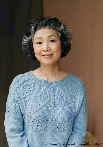 Рост Хироко 155cм, с окр. груди 90см, и показана голубая версия пуловера в размере 3. Рост Молли 175см, с окр. груди 107см, и показана жёлтая версия пуловера в размере 4.