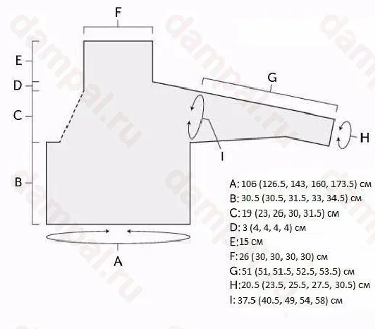 Окружность груди – 106 (126.5, 143, 160, 173.5) см.