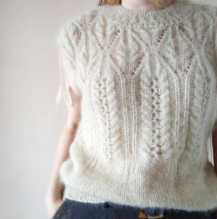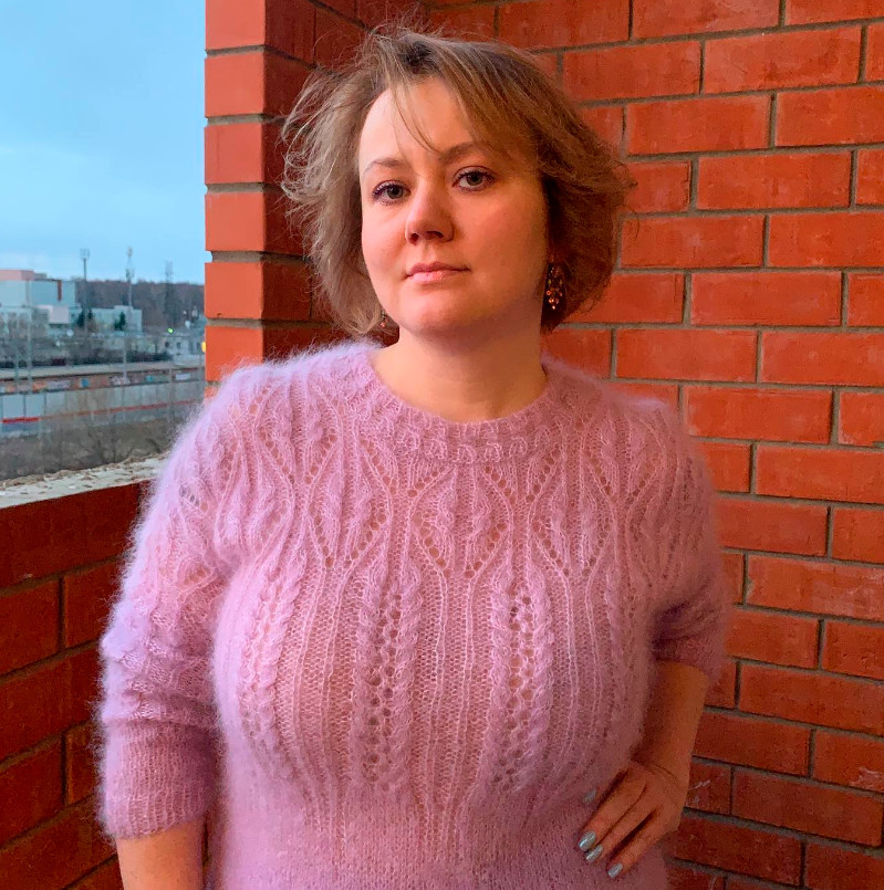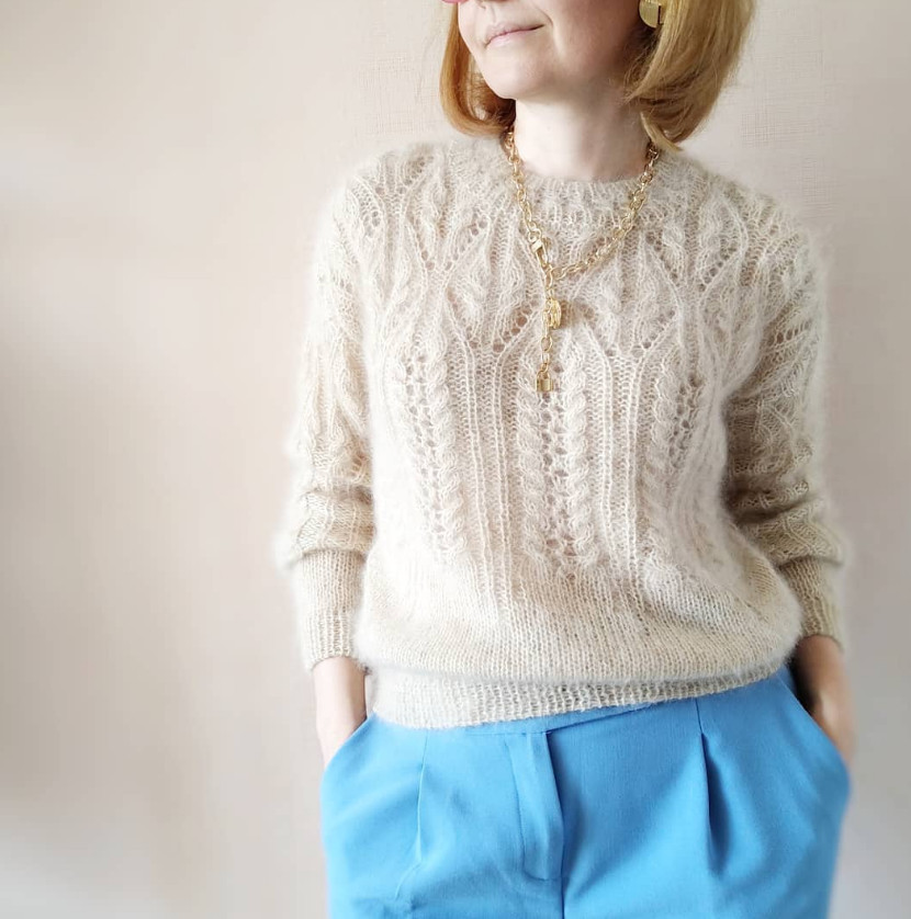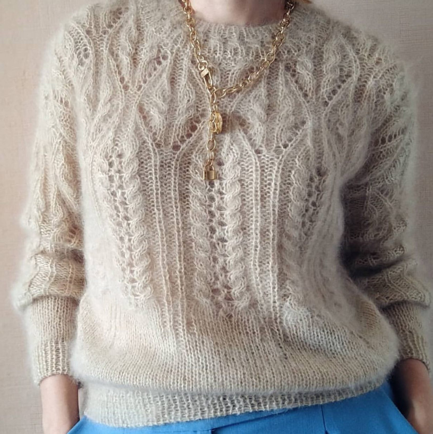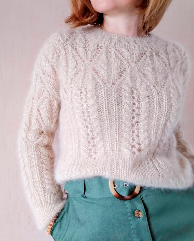 Рукава имеют форму перевернутой трапеции, с небольшим окатом. Расширение рукава происходит за счет постепенного добавления петель в узоре0 БЕЗ дополнительного прибавления петель по краям.